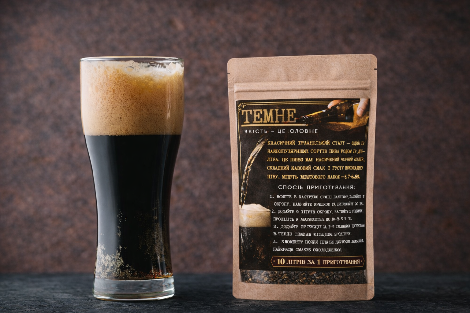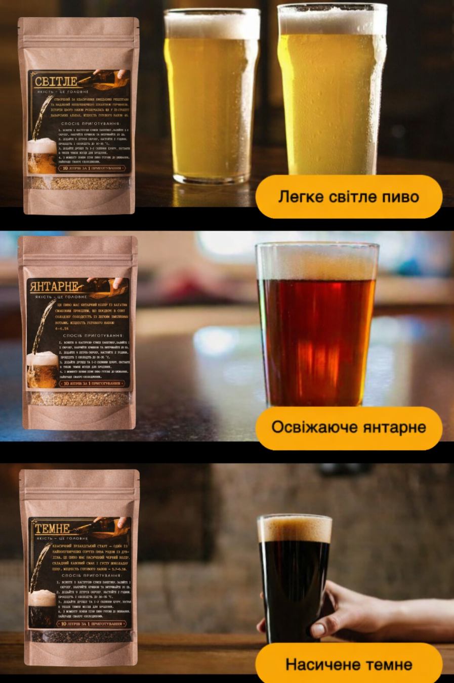 В наші набори входить усе, що необхідно для того, щоб приготувати смачне пиво! До замовлення доступні чотири сорти — світле, янтарне, бурштинове та темне!