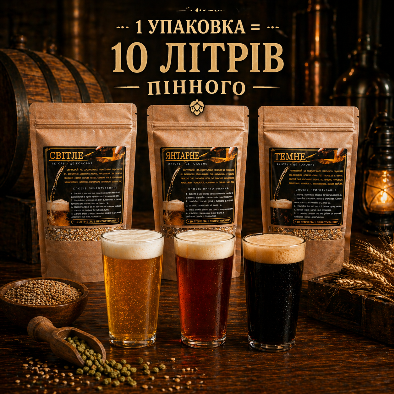 В наші набори входить усе, що необхідно для того, щоб приготувати смачне пиво! До замовлення доступні чотири сорти — світле, янтарне, бурштинове та темне!